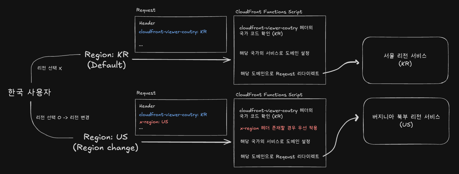 cloudfront-viewer-country헤더를 활용하여 사용자의 접속 국가를 판단하고, 해당 국가에 맞는 최적의 리전으로 자동 라우팅하는 로직을 구현하였습니다. - 사용자가 다른 국가의 리전을 선택하는 경우
