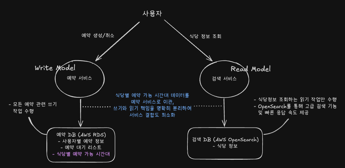 - 식당별 예약 가능 시간대 데이터를 예약 서비스로 이관하여, 예약 생성·취소 등 모든 상태 변경 로직과 쓰기 작업을 예약 서비스 한 곳에서 처리하도록 하였습니다.