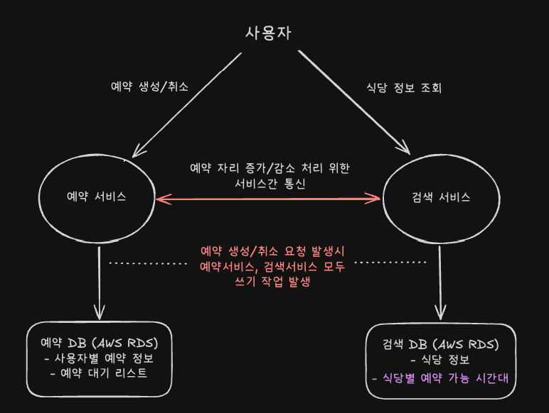 - 예약 생성 또는 취소 시, 예약 서비스가 검색 서비스의 API를 호출하여 해당 예약에 대한 식당별 예약 가능 시간의 자리를 증/감시키는 별도의 쓰기 작업을 수행해야 했습니다. 이는 예약 서비스와 검색 서비스 간의 의존도를 높였고, 시스템 복잡도를 증가시켰습니다.