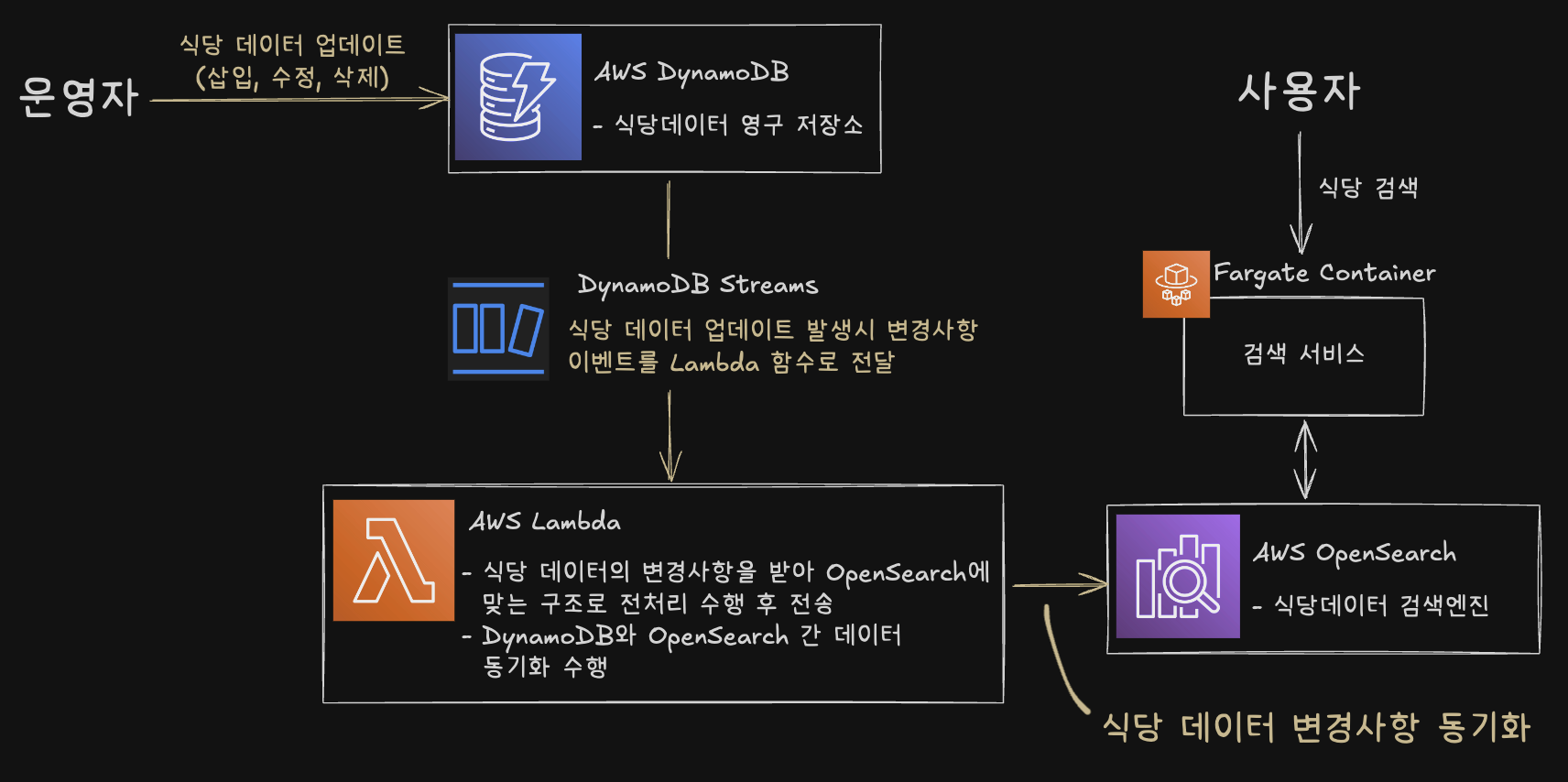 - DynamoDB Streams - Lambda - OpenSearch 구조로 데이터 변경의 실시간 반영과 자동 데이터 동기화를 구현했습니다.