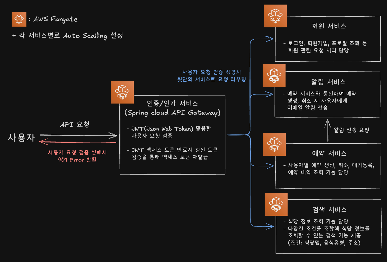 - 예약, 검색, 인증/인가, 회원, 알림 서비스 등 5개의 마이크로서비스를 AWS ECS Fargate에 각각 독립된 컨테이너로 배포하여 각 서비스가 개별적으로 확장 및 관리되도록 설계했습니다.