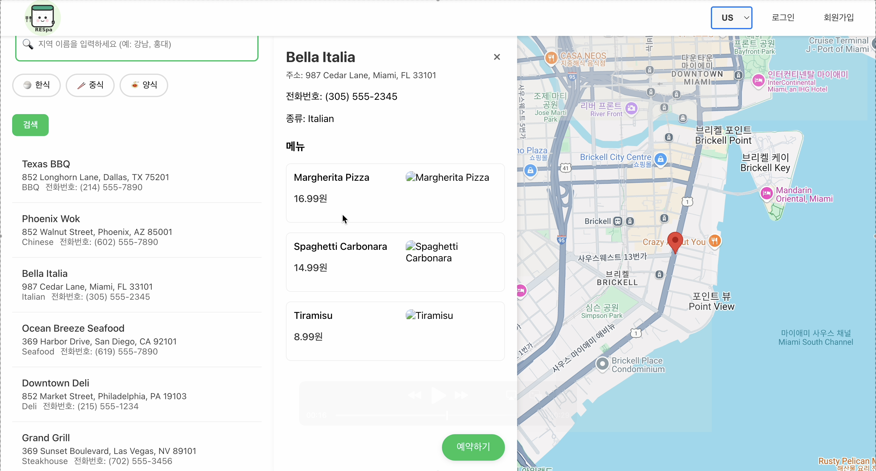 드롭다운 메뉴에서 미국(버지니아 북부) 리전 선택시 미국 식당이 검색되는 것을 확인할 수 있습니다.