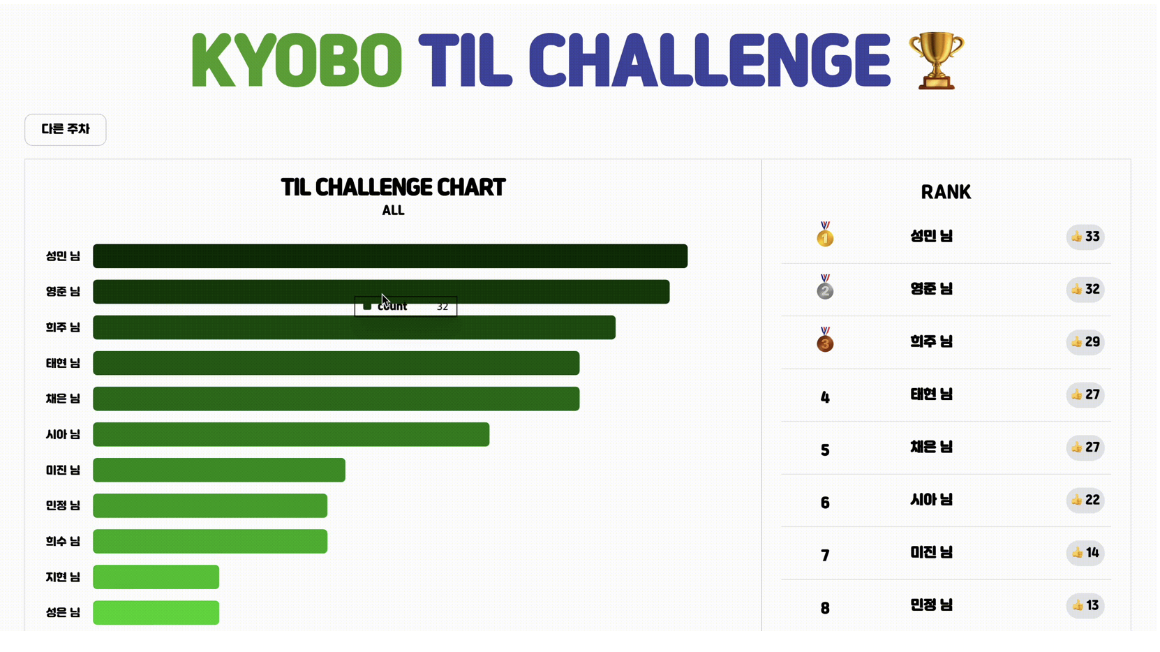 ์ด ํ๋ก์ ํธ๋ ๊ต๋ณด CDA 1๊ธฐ ๊ณผ์ ์ TIL ์ฑ๋ฆฐ์ง๋ฅผ ์ง์ํ๊ธฐ ์ํด ์งํ๋์์ต๋๋ค. ๋งค๋์ ๋๋ค์ด ์ง์ ์ํํ๋ ์ฑ๋ฆฐ์ง ๊ธ ๊ฒ์, ์ข์์ ์ง๊ณ, ์๋ณ ์ฃผ์ฐจ๋ณ ์ฐธ์ฌ ์ธ์ ์ ์ ์์ ์ TIL ์ฑ๋ฆฐ์ง ๋ด์ ํตํด ์๋ํํ์์ผ๋ฉฐ, ์ฃผ์ฐจ๋ณ ์ฐธ์ฌ ์ธ์๊ณผ ์ข์์ ์๋ฅผ ์นํ์ด์ง์์ ํ๋์ ๋ณผ ์ ์๋๋ก ์๊ฐํํ์ต๋๋ค.