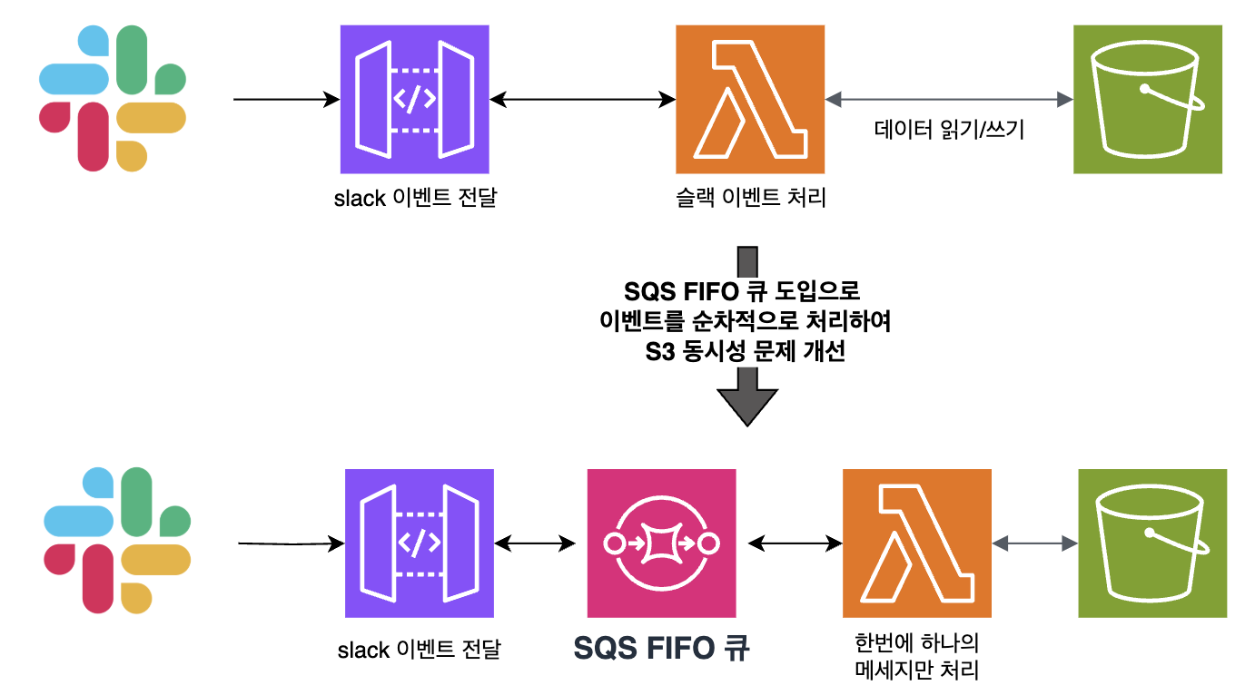 ์ด ๋ฌธ์ ๋ฅผ ํด๊ฒฐํ๊ธฐ ์ํด AWS SQS์ FIFO ํ๋ฅผ ๋์ ํ์ต๋๋ค. ์๋ก์ด ๊ตฌ์กฐ๋ ๋ค์๊ณผ ๊ฐ์ต๋๋ค.