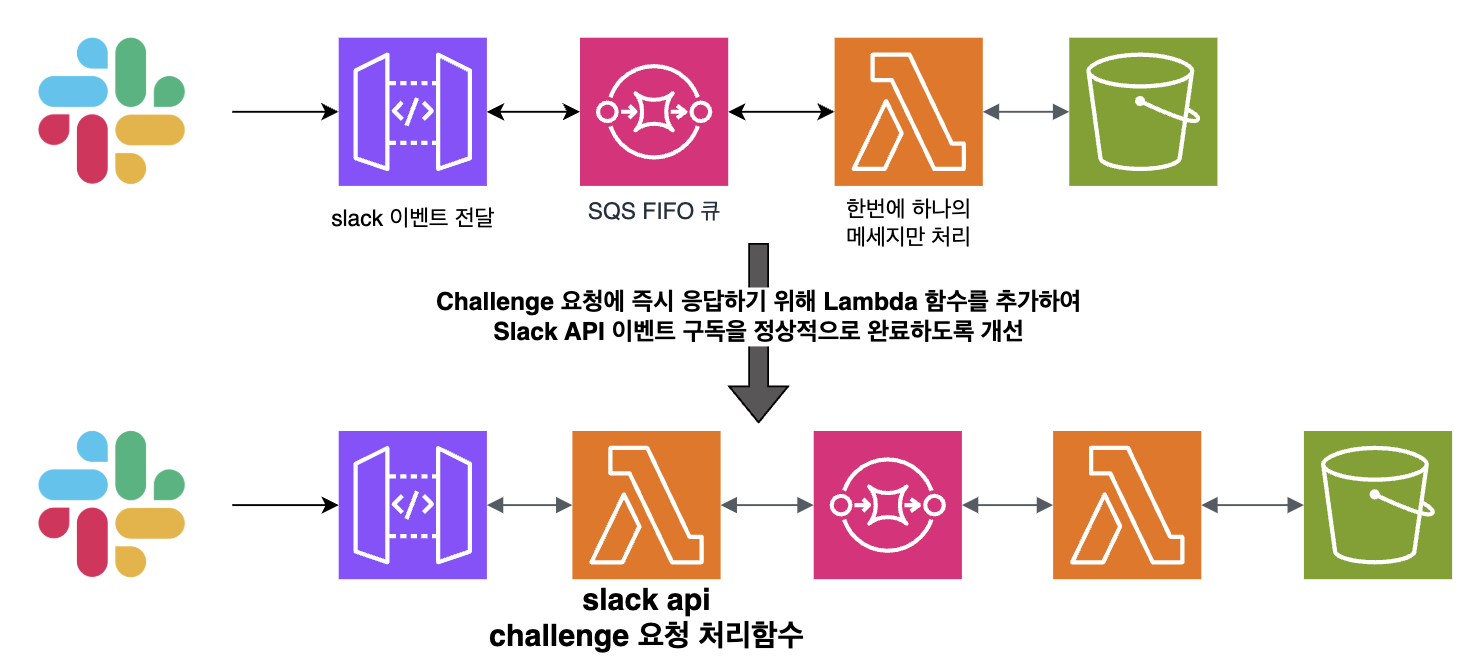 ์ด ๋ฌธ์ ๋ฅผ ํด๊ฒฐํ๊ธฐ ์ํด Challenge ์์ฒญ์ ๋ํด์๋ง ์ฆ์ ์๋ต ๊ฐ๋ฅํ ๊ตฌ์กฐ๋ฅผ ๋์ ํ์ต๋๋ค. SQS๋ก ๋ณด๋ด๊ธฐ ์ Challenge ์์ฒญ ์ ์ฉ Lambda ํจ์๋ฅผ ์ถ๊ฐํ์ฌ, ์ด Lambda์์ Slack์